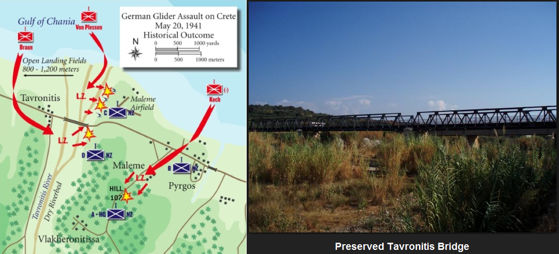 The airfield at Maleme figured prominently in the German plans for the capture of Crete. “Group West”. Commanded most of the 1st Assault Regiment under the command of General Meindl, consisted of three detachments: one to land at the Tavronitis Bridge; one to destroy the AA positions and ease the way for the following troop-carrier transports; and one to land on the slopes of Point 107, high ground to the south of the field. Major Braun drew the task of seizing and holding the long span over the dry Tavronitis. Given free rein to plan his assault, he decided to daringly land in the dry bed itself and then take the British MG posts which guarded each side of the bridge from the rear.Attacker: German (Abteilung Braun, Bataillon I, Sturm Regiment 1)