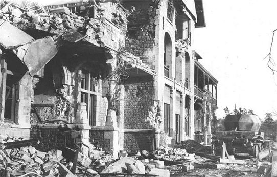 Sanatorium after battle. Knocked out FlaKPz IV/20 sits in front.