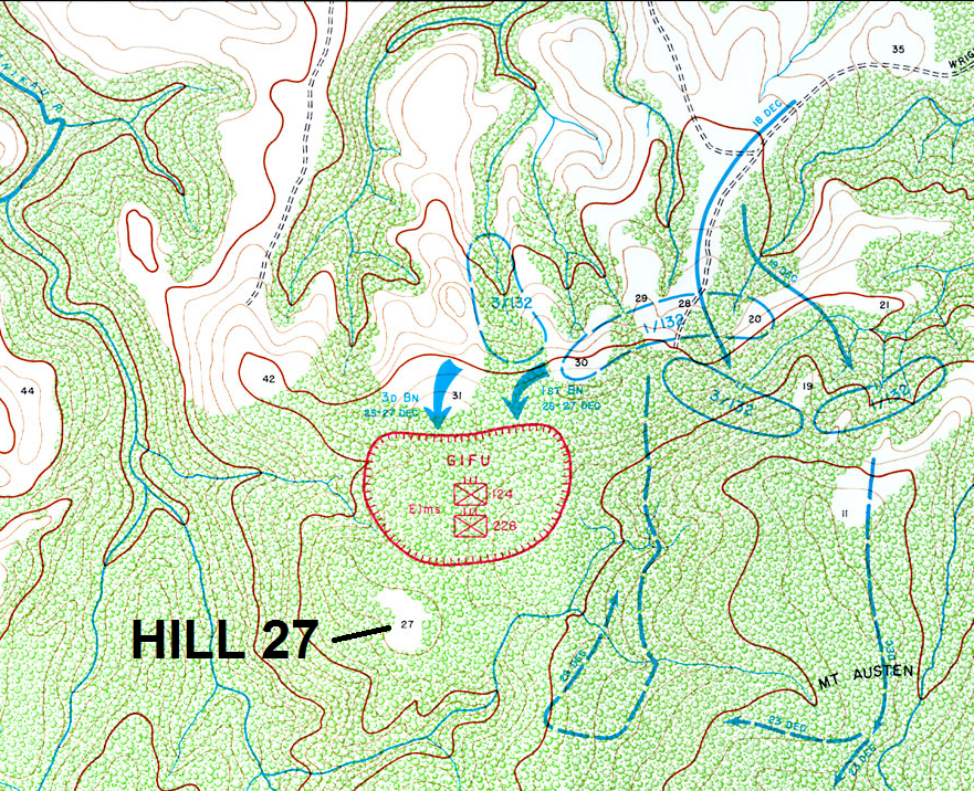 Hill 27 was a separate rocky elevation, 920 feet high, just east of the Gifu. The leading assault troops of the 2nd Battalion gained the summit of the hill at 0907 without firing a shot. By 1130 hours the entire assault force had reached the summit, the Japanese having been completely surprised. The 2nd Battalion began to organize a defense on Hill 27, but digging in was difficult. Before the preparations could be completed, the Japanese to the north had recovered from their surprise and attacked to recapture the hill.Attacker: Japanese (124th and 228th Infantry Regiments)