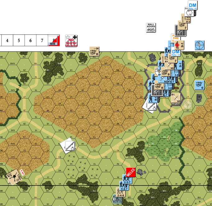 | 2024-03-17 | (D) Vic Lauterbach | vs | JM | German win | Jim wanted the Sturmtigers, so I took the British. I set up to hold 43F2 and 43B3 as long as possible the retreat to the walled farm. GT1 was a disaster. I broke/revealed the 76LL on its first AP shot (after a TH DR > D5). I repaired it, missed a Sturmtiger in my PFPh and got obliterated by it in his DFPh! Jim took my screening positions by GT5 and closed in on the walled farm in GT6. I got two front hits on Sturmtigers that bounced off before losing both PIATs (one broke and got OVR by a Sturmtiger). I hoped Jim couldn't reach the 248 in building 43O10, but MMG fire on a 447 generated a hero who got there with a CX 247 and locked my last HS in melee giving Jim the win! Jim: Pick your 380* shots carefully; you won't get many. I hit the ammo depot* (made building 43M9 rubble) and made 43O7 rubble with a near miss but never hit infantry in a stone building. This is a fun scenario, but the Sturmtigers are frustrating. The German infantry have to win this one which came down to CC in three locations on the last turn. *SSR3 does not give a target type for the ammo depot. We used unarmored vehicle with the no explosion clause NA [E10.6]. | ||