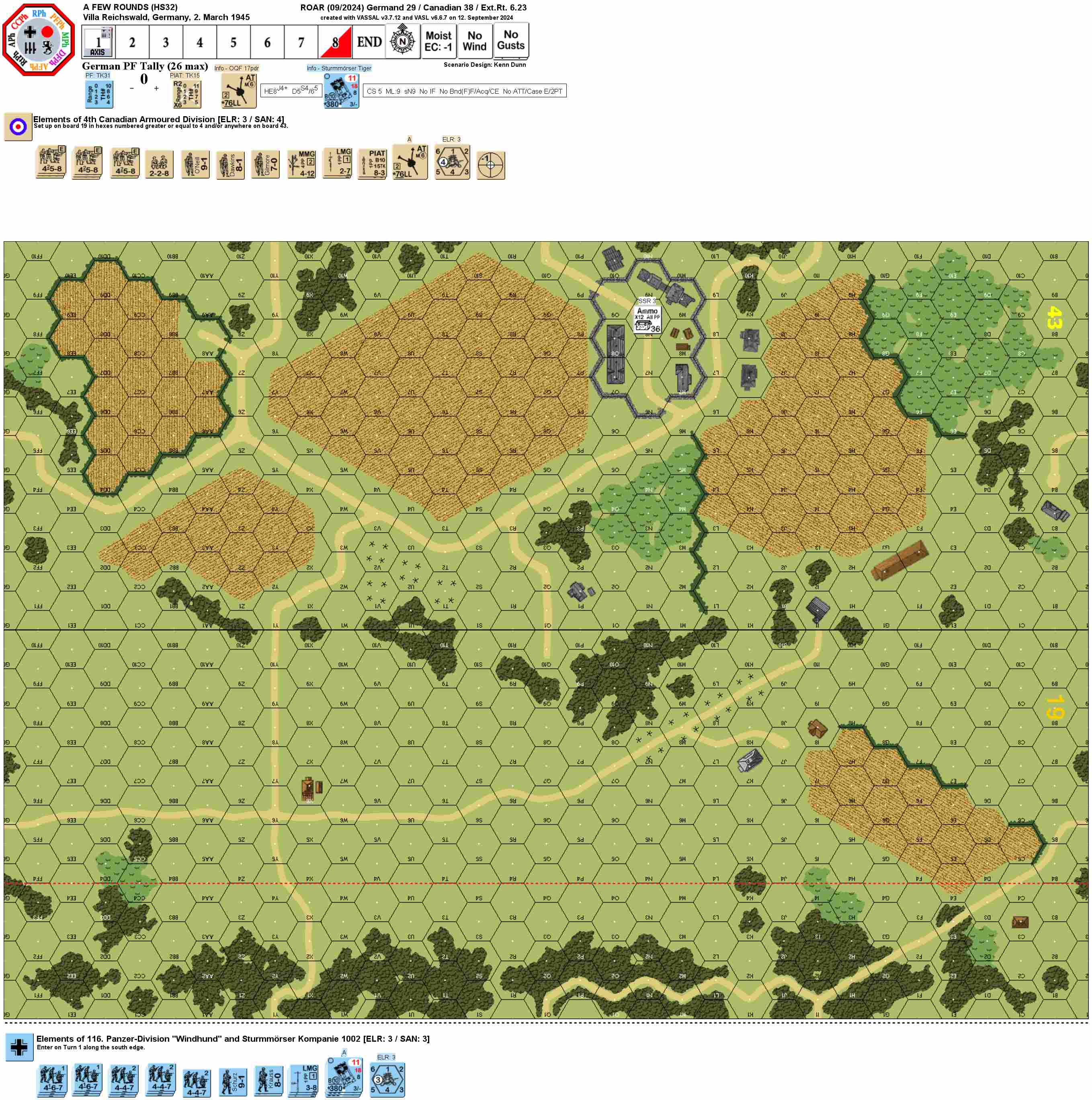 | 2024-10-04 | (D) X von Marwitz | vs | Bruce Probst | Canadian win | HS32 A FEW ROUNDS – AAR See this AAR with pictures at Gamesquad.com https://www.gamesquad.com/forums/index.php?threads/aar-hs32-a-few-rounds.200540/ Set in March 1945, this action is part of the huge but yet for some reason little known battle for the bridgehead at Wesel, objective of the British/Canadian operations Veritable and Blockbuster and the U.S. operation Grenade, in which more than a million Allied soldiers and awesome amounts of materiel were involved. The U.S. operation was delayed by some 13 days by the Germans sabotaging dams which resulted in the prolonged flooding of the Roer river making a U.S. crossing impossible. Thus, for that time, the British/Canadians had to fend for themselves under adverse weather conditions and terrain which channeled their advance. The most costly tank battle of the war for the Canadians happened at the Hochwald Gap, where they attempted to push trough at all costs and in which they eventually succeeded, albeit at very high losses. The Villa Reichswald is located in the said Hochwald Gap. I had selected this scenario to play with Bruce Probst, who I had invited to stay for a couple of days at my place during his trip to Europe, where he also attended Arnhem Tournament. The Hochwald Gap is not far from where I live, so I had recruited a historian for a battlefield tour to this place. A number of years ago, this battle was covered in a TV documentary in which this historian was involved, which has become quite popular in the internet. Here is one of the links to that TV documentary: https://www.youtube.com/watch?v=daFdUZLZimA I tried to get some more information by the scenario designer Kenn Dunn on his sources, as I could not find anything specific in the internet. Alas, to date, I got no response. I can state that there is no location closeby named „Hufscherberg“ as specified in the scenario card – merely a „Hufschen Weg“ and „Haufschen Hof“. I am also not sure if Villa Reichswald was „completely flattened“ by the detonation of an ammo depot. Given the date on the scenario card, this ammo depot would most likely have been of German origin before they retreated from the area. Today, there is a Villa Reichswald building, but I do not know how much of it has been rebuilt after the war. After this current contemporary on-site report, let us get back to the scenario itself: The German objective is for the Germans to have no Good Order British MMC in any board 43 building. The Canadians are the Scenario Defender and have eight 458 Elite squads led by three leaders (9-1, 8-1, 7-0). As SW they have one MMG, two LMG and two PIATs. A powerful ATG, a 76LL 17-Pounder with Crew round off their outfit. The Germans have13 squads, half 467s, half 447s led by three Leaders (9-1, 2x 8-0) and a meager SW support of three LMG. The attraction of the scenario are the three Sturmmörser Tiger with their massive 380mm tube firing rocket projectiles. An SSR gives special instructions on what happens, if one of these 380mm projectiles hits the ammunnition depot in 43N8. The effect is basically, that everything in and in 1-hex range around the ammuition depot will be attacked by 36FP plus a varying Heavy Payload modifier. So obviously, this is what the German should want to see happen. With 7.5 Turns, the scenario is quite long, but time will be needed by the Germans to cross a lot of Open Ground and Plowed Fields while getting all British MMC to non-Good Order is also no small feat. ROAR has the scenario pro Canadian at 38 wins to 29 German wins as of October 2024. The Terrain: Altogether, looking at the historical terrain, it is reasonably well reflected by the geo-boards. There is much Open Ground and Plowed Fields along with some patches of Woods, while Orchards are out of season. The few buildings on board 19 are only single hex and isolated. Some Woods on the borders of board 19 and board 43 in the middle of the playing area will shield some approaching German units from LOS from board 43 buildings. The board 43 buildings are somewhat dispersed, but mostly concentrated around the ammution depot and its vincinity. Canadian Considerations: Looking at their OoB, the Canadians are superior in morale which is paired with them defending the more favorable terrain with higher TEM, while the numerically superior Germans must cross considerable swathes of Open Ground. However, they have quite a large area of enemy approach to cover. And to force the German attackers to divide their force, the Canadians will want to set up some units in outlying buidlings and not merely around the walled compound, which may be pulverized along with anything in it, if the ammo depot gets hit by a Sturmmörser. In order to delay the attacking Germans and to take advantage of their having to cross Open Ground, the Canadians will likely want to set up some of their Infantry in the patches of woods in the middle of the playing area. But this is not easy: The Canadian Infantry is not really numerous, and - as aforementioned – some of it will likely set up in outlying buildings and some in the walled compound. That leaves not that much for the patches of Woods. On top of that, it will not be trivial for the Candadians to fall back from forward positions. Likely, he will lose some units in doing so. Thus finding the right balance in the number of forces and the time to fall back while this might still be possible has no sure recipe, and luck will also play into the outcome. The nature of the Canadian setup will likely mean, that their three Leaders will also set up dispersed. Losing a Leader in one of the three areas will be a hard blow. Luckily, the same is true for the Germans, who also only have three Leaders. Trying to eliminate these or at least to break them should be a priority, because it will be the Infantry in the end which needs to win the scenario. Having German units break in the middle of the Op