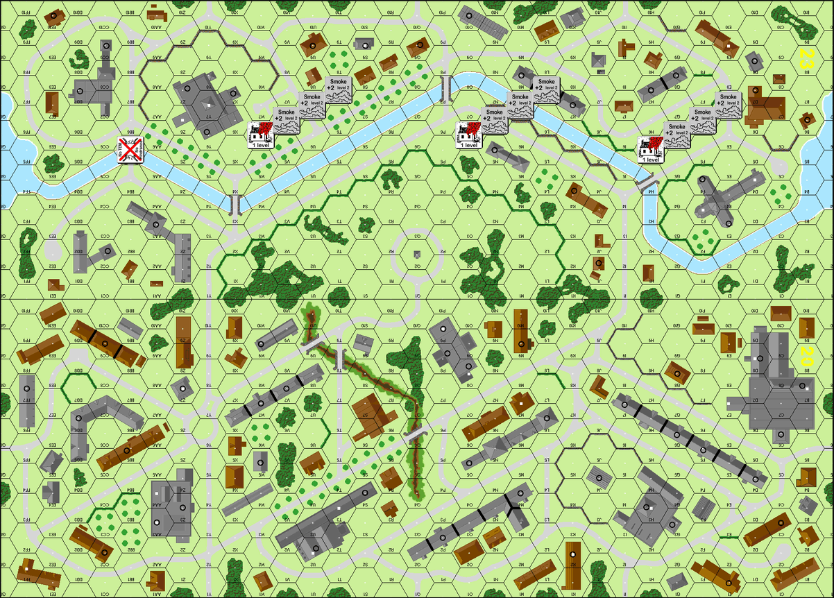 Calais, and all the troops in it, was doomed to fall – it was only a question of time. The 2nd KRR was given the task of holding the three bridges over the Marck Canal. It had a handful of light tanks and scout cars for support. Throughout the 25th of May, the British were subjected to a terrific barrage, setting fire to a number of buildings until the whole of the battalion’s front was obscured by smoke. Then, at 1900 hours, the barrage lifted and enemy infantry, led by tanks, stormed toward the three bridges simultaneously. . .Attacker: German (Infanterie Regiment (mot) 69 and Panzer Regiment 7)