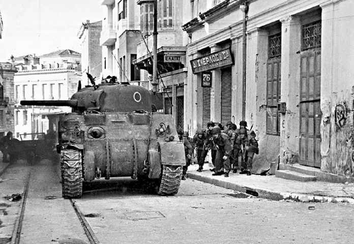 Timeline: the battle between left and right in Greece in 1944. . . .LATE SUMMER 1944: German forces withdraw from most of Greece, which is taken over by local partisans. Most of them are members of ELAS, the armed wing of the National Liberation Front, EAM, which included the Communist KKE party. . .OCTOBER 1944: Allied forces, led by General Ronald Scobie, enter Athens, the last German-occupied area, on 13 October. Georgios Papandreou returns from exile with the Greek government. . . .2 DECEMBER 1944: Rather than integrate ELAS into the new army, Papandreou and Scobie demand the disarmament of all guerrilla forces. Six members of the new cabinet resign in protest. . . 3 DECEMBER 1944: Violence in Athens after 200,000 march against the demands. More than 28 are killed and hundreds are injured. The 37-day Dekemvrianá begins. Martial law is declared on 5 December.Attacker: Partisan (ELAS) (Ethnikos Laikos Apeleftherotikos Stratos (ELAS) Partisan Division "Roumeli")
