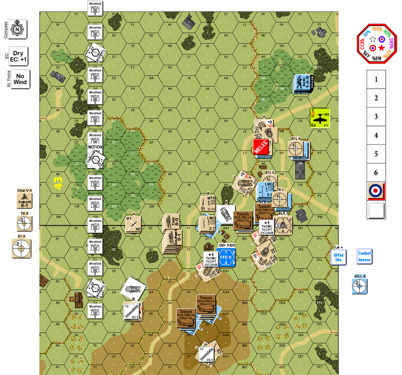 | Misc Rules: | Orchards: Cactus Patches (B14.7), Cactus Hedges (B9.7). A: Air (E7) Turn 4, D: Known Minefield |