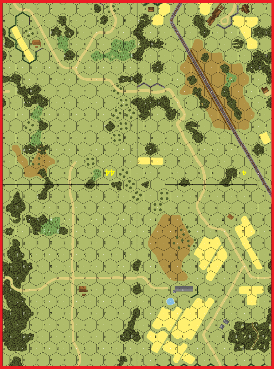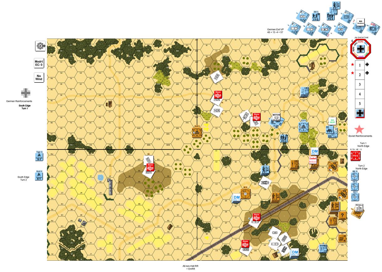 The breaking dawn on the 12th saw both sides slamming artillery barrages into the grainfields around Prokhorovka. Like two tides of steel and flesh rushing towards each other, the 5th Guards Tank Army and II SS Panzer Corps collided just south of the town itself. As an aerial battle raged overhead, the SS tankers stopped to engage the Russians at optimal range while the SS Panzergrenadiers dismounted and prepared their own tools of carnage. The stage was set, the cast was ready for the final battle. Scenario 3 of 3 for Broadway to Prokhorovka Mini-CG. (1st Group Shown)Attacker: Russian (5th Guards Tank Army)