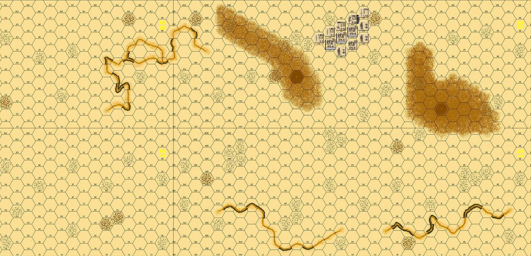 In the LiS opener, I drew the Axis. Our extra force picks were predictable: OBA and Grants for Jim and OBA and Panzer Specials for me. Predictably, neither of us hit anything early, until our OBA came in. It fired for the whole game! I drove along the track with the Italians. Their sappers worked on the mines while the M14/41s drew Jim's AT fire. My DAK force went into the gullies along the south edge with the AFVs on their right. The Panzers risked the wire, but the rest drove around it. Miraculously, I only lost one M14/41 until I got to 30/31I. Smoke from wrecks shielded my dash off the board, and a PzIIIH exiting in my GT7 MPh gave me 48 exit DVP. Overall, it was fun, but Jim's high OBA IFT rolls kept me in the game. Jim: Due to the extra +1 LV hindrance on the half boards, I setup to draw Vic into a kill zone at 30/31I-Q. Too many +4 and +5 TH DRs through dust, FFEs and wreck smoke! I had to rush everything south to block and I got there too late. Decent game but too easily dominated by OBA. I needed more OBA KIAs to win.