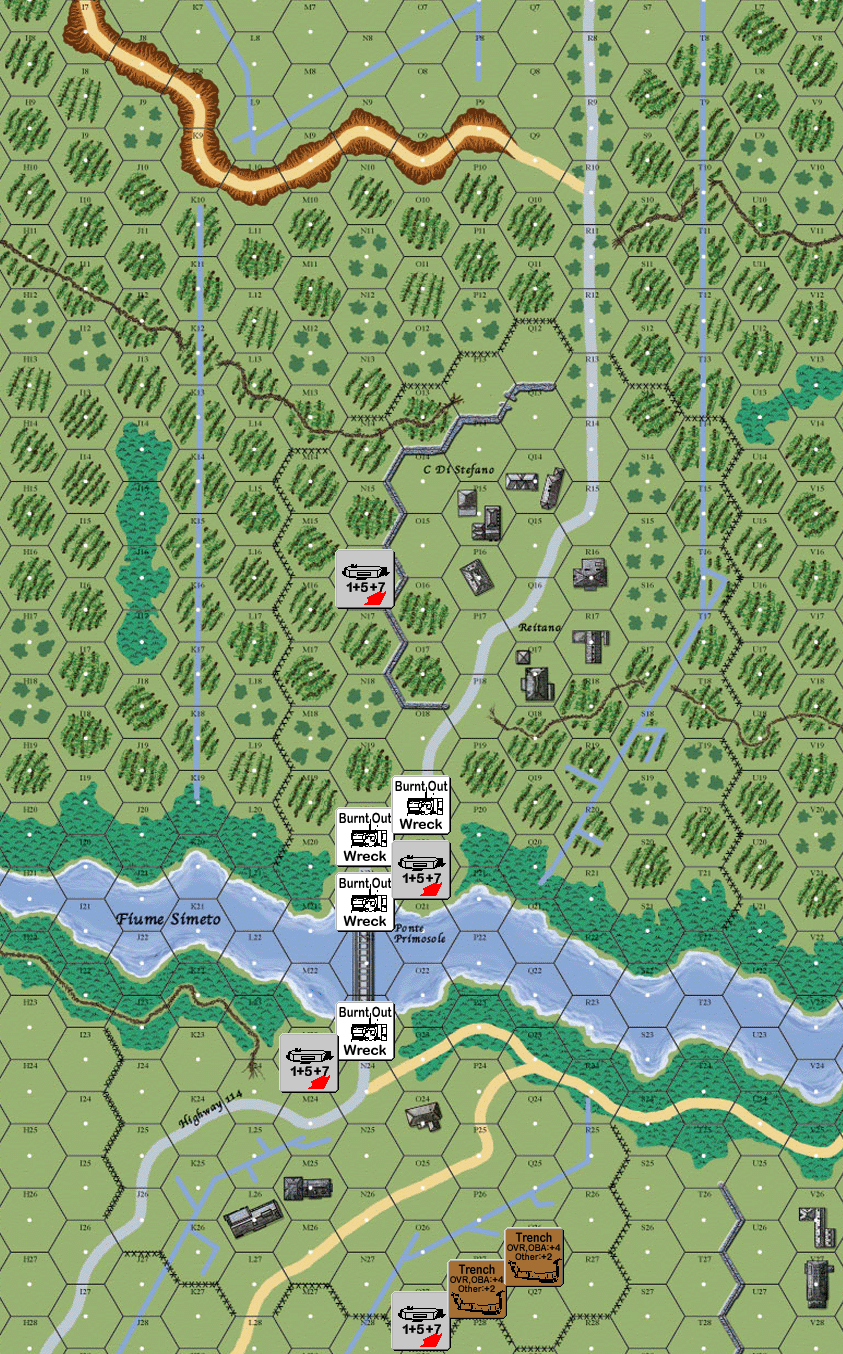 After the night assault seized the bridge and a thin lodgement north of the Simeto, problems were experienced communicating to follow on units that the bridge had been captured. As the companies holding the lodgement began to come under increasing pressure, the message finally got through. Elements of the 44th Royal Tank Regiment and the 6th Durham Light Infantry Battalion rushed forward to exploit the opening. As the lead elements of this force reached the north end of the bridge, a previously undetected "88" opened up and quickly brewed up two Shermans. As the British Light Infantry and supporting tanks attempted to push forward and clear the vineyards north of the river, they faced stiff opposition from German fallschirmjagers.Attacker: British (A and D Companies, 8th Durham Light Infantry, 50th Northumbrian Division/A Squadron, 44th Royal Tank Regiment)
