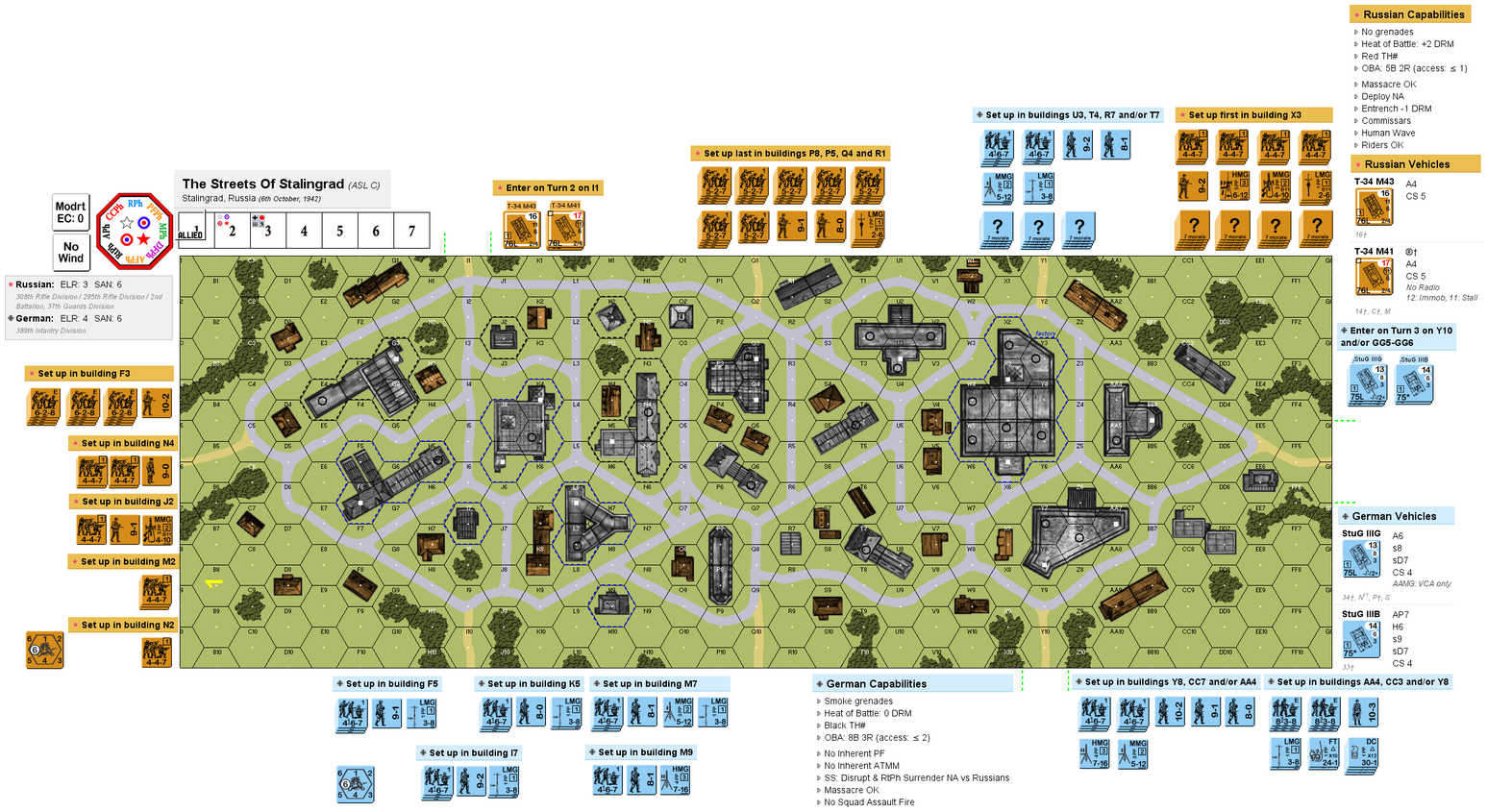 | Misc Rules: | Sequential setup; dr to see who moves first. Russian units in Bldg X3 (Factory B23.74) are Fanatic |