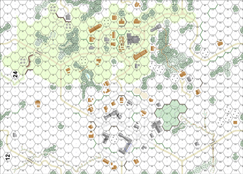 | In the U.S. setup the four M5A1s of the 83rd Reconnaissance Battalion set up south of hexrow R and the two Shermans of 2nd Platoon set up with their CA towards the southern hexspine (add “of hexrow R” at the end of the setup instructions for the 83rd Reconnaissance Battalion and add “hexspine” at the end of the setup instructions for the 2nd Platoon). | MMP |