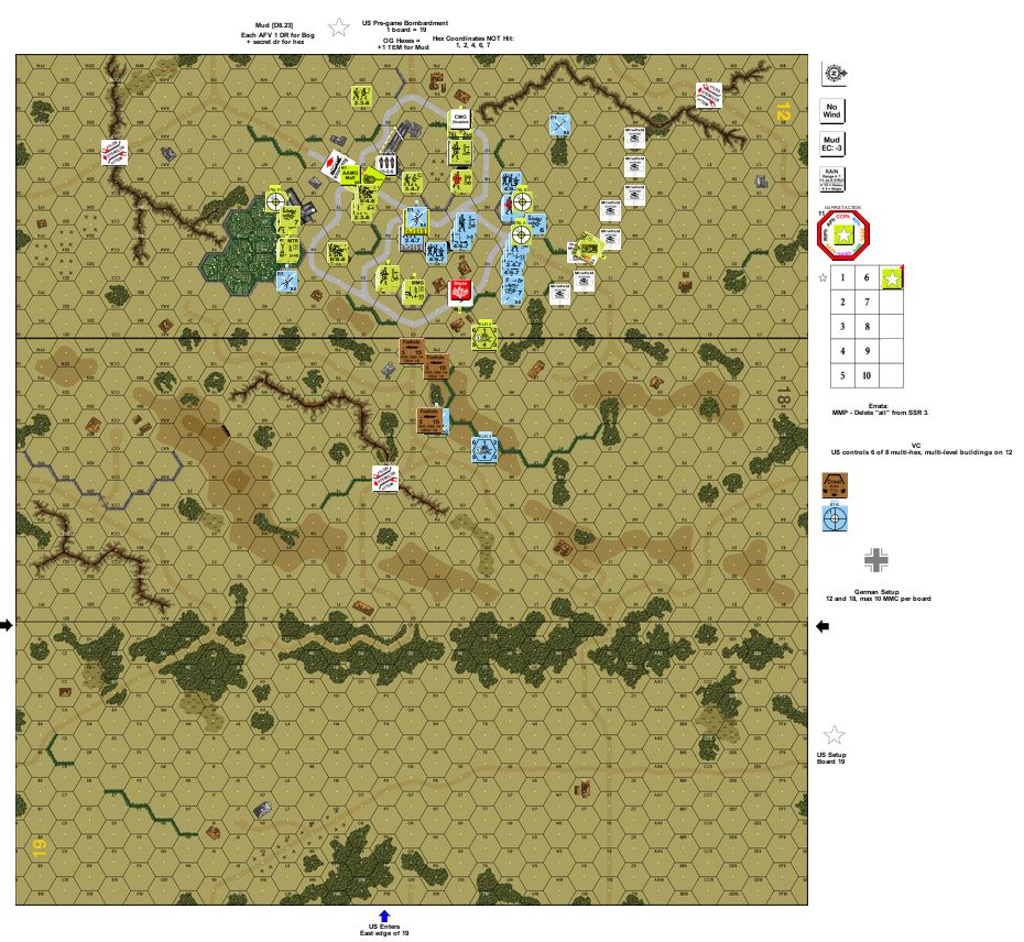 | Misc Rules: | Mud, Falling Rain, pre-game Bombardment, German wins if kills 3 AFV |
