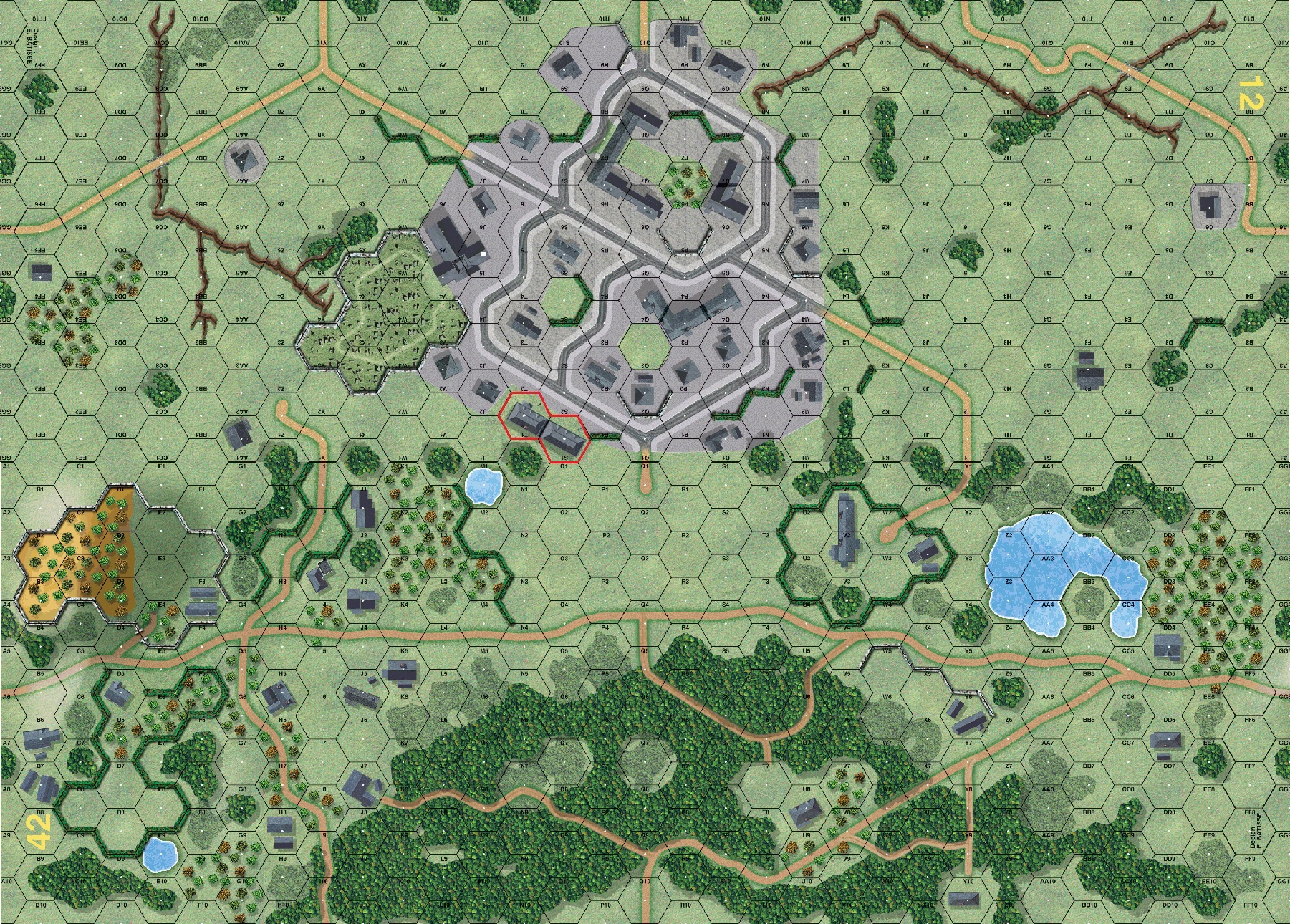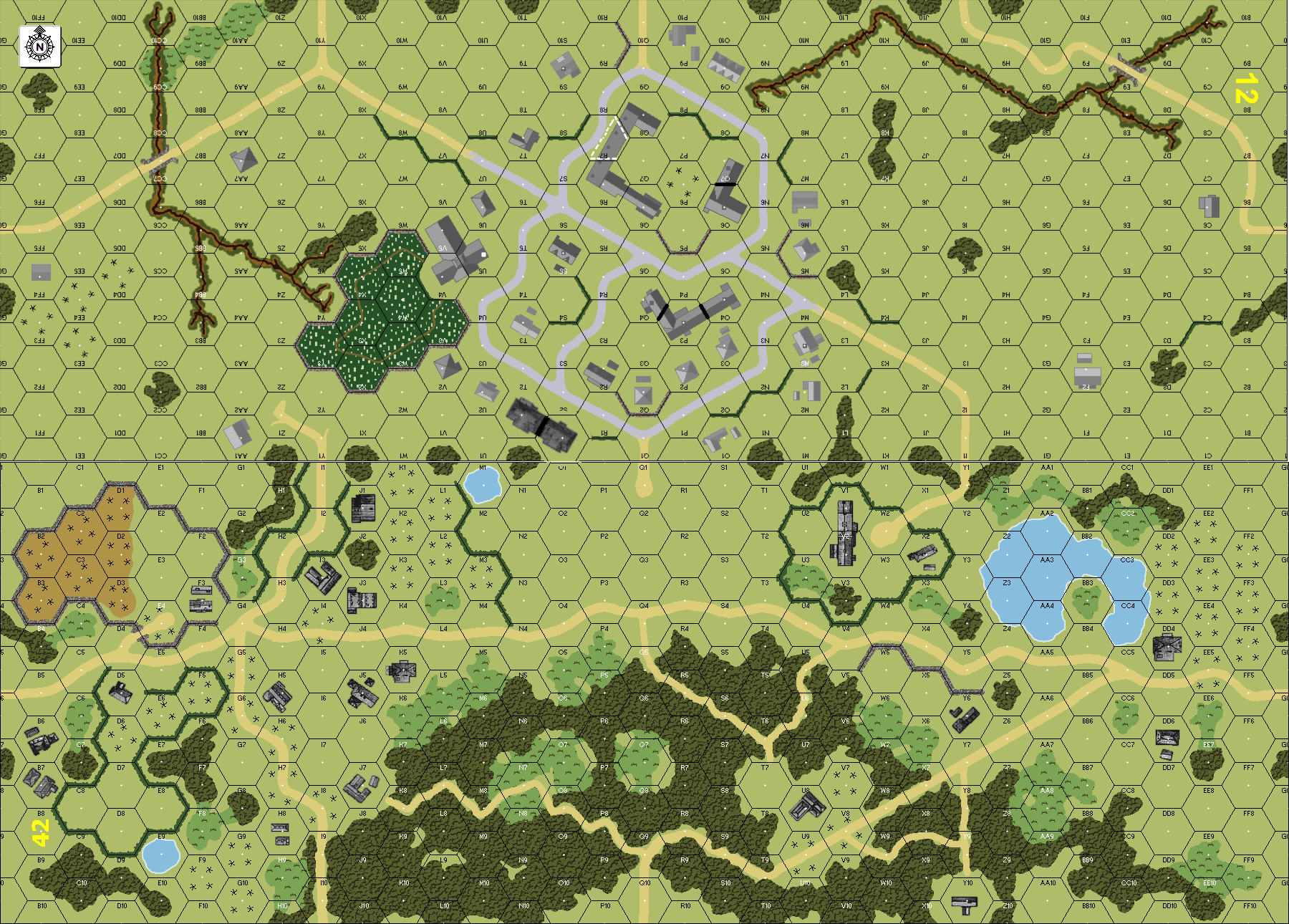 | Misc Rules: | Mist, Stone Buildings, Water obstacles are Frigid, Bldg hex 12R7 is Marketplace |