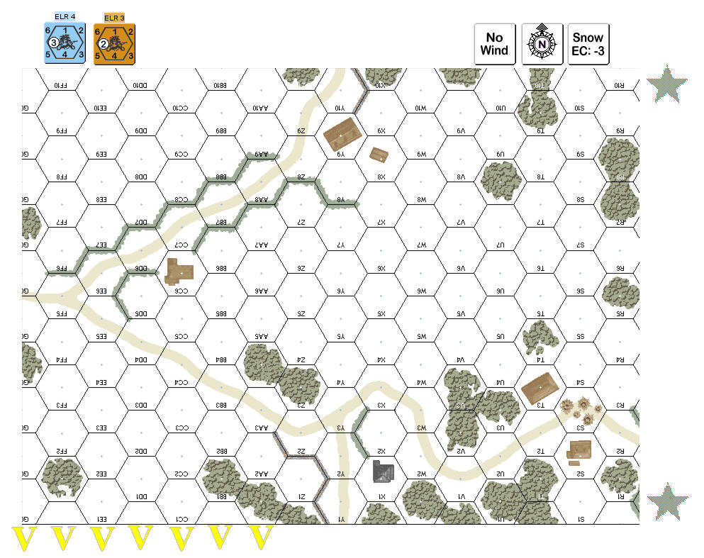 2022-10-27(A) Mark Thompson vs Germans (Marc Grad) Russian winThe Russians came in along the Southern road relatively unscathed by maintaining concealment and using a 9-0 Commissar to boost morale. Massed 6-2-8 FGs broke the German MMG squad in building X1 and the PIV and 37AT were unable to slow the T-34s in positioning their exit through the BB1-AA1-Z1 woods (via trail break). The Germans conceded on Turn 4. IMHO, play mechanics of Extreme Winter (e.g., secret Bog Check DR/dr) combined with platoon movement are cumbersome (and too dice determinative) - might playability to remove secret Bog Check DR/dr for Russian AFVs in exchange for German balance and/or other concessions.