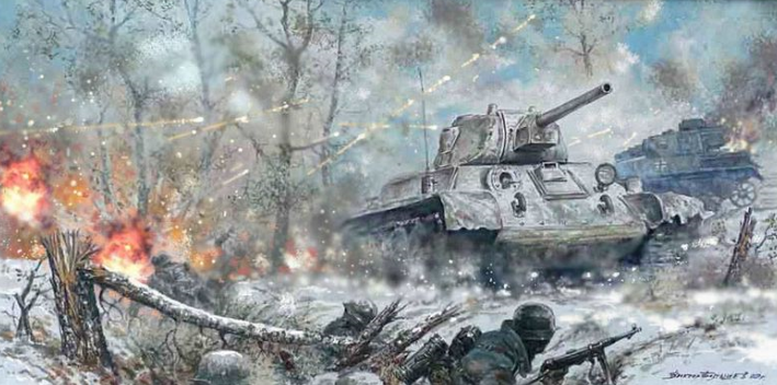 The German army was frozen in place. Bitter cold and deep snow made the thinly-clad Wehrmacht dig in and fight first for warmth, then the Russians. The Siberians were well equipped for war in the snow, but the Soviet High Command still threw them piecemeal at the German strongpoints. The much-heralded Soviet winter counteroffensive was in fact a series of small-unit actions amongst the white and evergreen of the Russian winter. The raid on the crossroads northwest of Staritsa was just one of many. To protect the critical crossroads, the Germans had cut a maze of trenchworks through the snow. If not in comfort, at least in cover, sentries peered into the snowy distance. Deep silence. Then, the sound of tank engines. The white, boxy shapes of T-34s with their snowmen-like supporting troops emerged from the east heading straight for the crossroads.