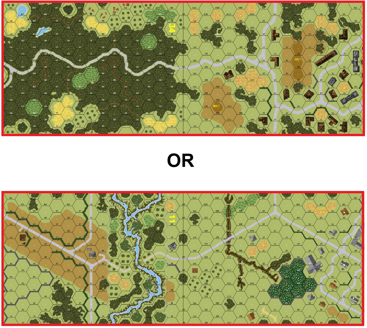 Rommel’s 7th Panzer Division on a bypass bumped into units protecting the Belgian southern flank. This lightly-held part of the Belgian defense was occupied by units of the 10th Motorcycle Company, which had been scattered into three different defensive strongholds. At 1440, German motorcyclists appeared on the road, immediately triggering fire from the Belgian platoon. . .*** This earliest version has two mapboard configurations which the Belgian player sets up defensively on both with forces of 3x4-5-8, 1x2-4-8, 2xLMG, 9-2 and 8-0 leaders, draws cards to either remove or add additional forces on both boards (Roadblock, A-T Ditch, T-15(b) tanks, more infantry, etc). German player then enters on east edge of one of the mapboard choices.***Attacker: German (Kleinschmidt Kompanie, Kraftradschützen Battalion 7 and 2 Kompanie, Panzer Regiment 25)