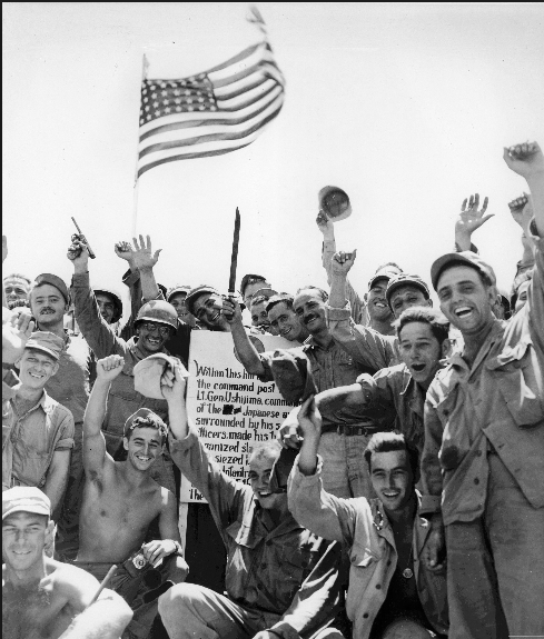 US Army soldiers celebrating the capture of Hill 89, Okinawa, Japan