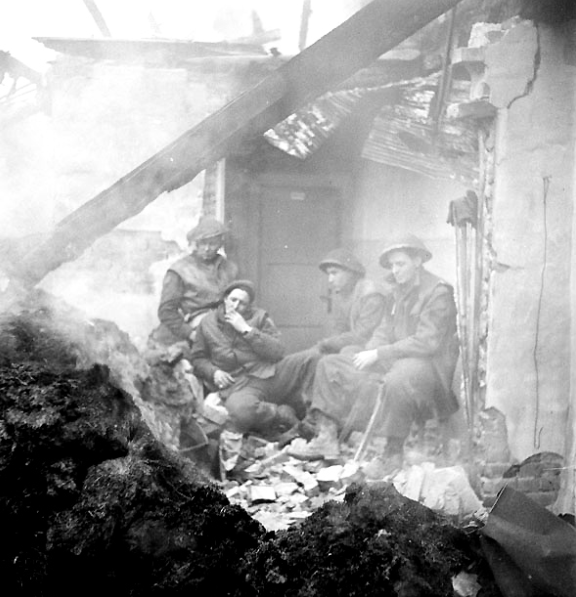 Infantrymen of the Regina Rifle Regiment keeping warm in the smoldering ruins of a house, Zyfflich, Germany, 9 February 1945