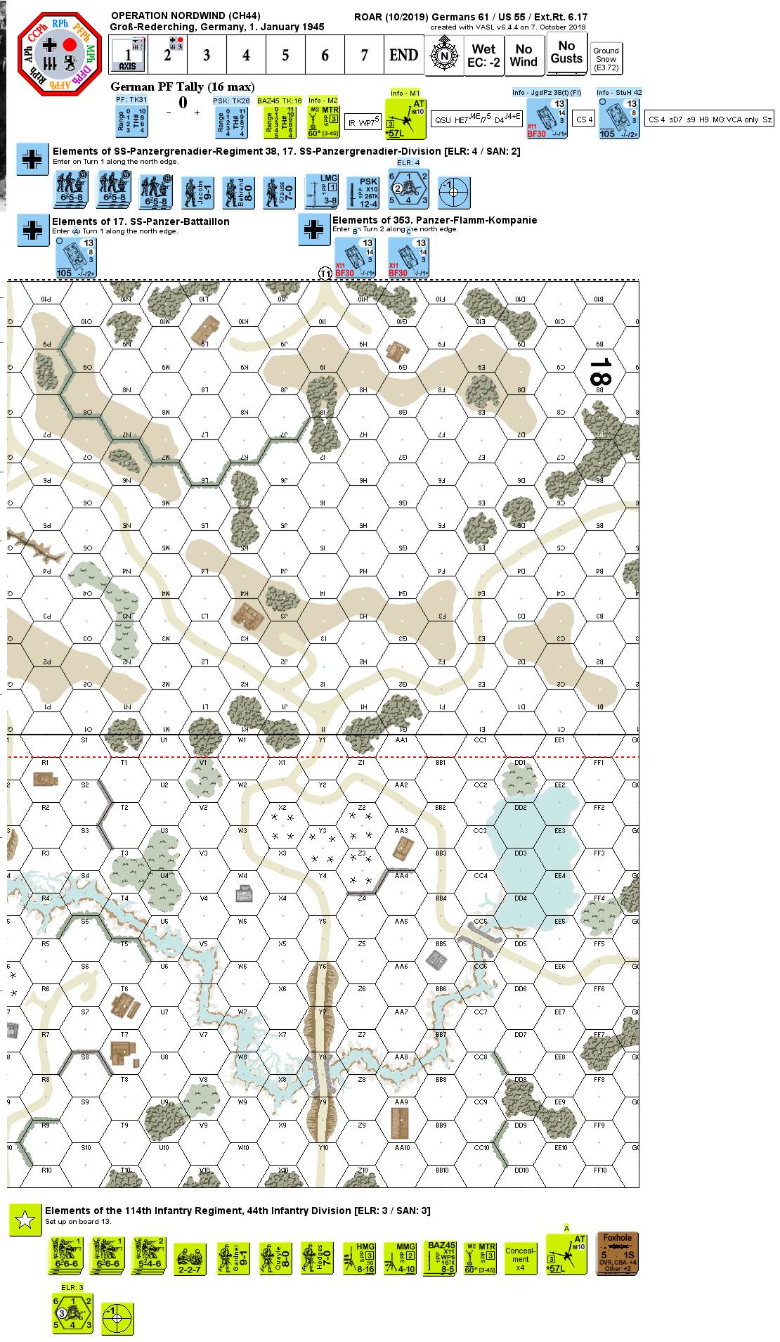 Operation Nordwind, known as the second Battle of the Bulge, has been overshadowed over the years by the immense struggle taking place in the Ardennes. At 11:30 Pm, December 31st, eight German divisions poised along the French border of Alsace-Lorraine attacked without any preliminary artillery support. Near the town of Gross-Rederching, elements of the 114th Regiment attempted to hold off the advance elements of the 17th SS Panzergrenadiers, reinforced by SPs, including flame-throwing Hetzers of the 353rd Panzer Flamm-Kompanie. . .Attacker: German (SS) (38th SS Panzergrenadier Regiment, 17th SS Panzergrenadier Division and the 353rd Panzer Flamm-Kompanie)