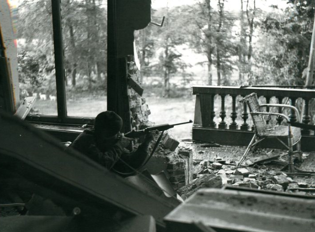 British Paratrooper taking aim from the first floor balcony of a hotel in Oosterbeek