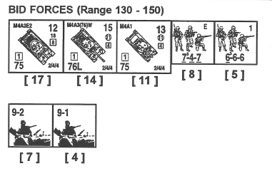 Abilene Bidding System scenario - American bids for other forces (tanks and armor leaders). "As the Allies approached the German border, enemy resistance increased. In one town near Strasbourg, the Americans captured one of the last remaining supply lines of the retreating Wehrmacht. The Germans promptly counter-attacked, starting a firefight which lasted through the night. As word of the heavily armed relief force reached battalion HQ, the Americans too rounded up a scratch force to throw into the fray. Neither side found itself ready for the sudden role of attacker thrust upon each."Attacker: American (Task Force Nixon and relief force and BID FORCES)