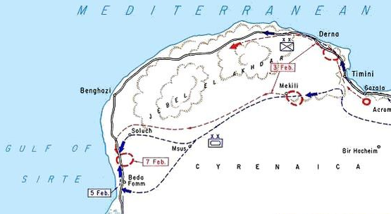 In early February 1941, with the Italian 10th Army evacuating Cyrenaica, the Australian 6th Division pursued them along the coastal road through Benghazi while the 7th Armoured Division hooked south and cut them off at Sidi Saleh along the Benghazi-Tripoli road. Although some Italian medium tanks from the Special Armoured Brigade almost escaped the trap, they were destroyed by British anti-tank guns, and the Italians then surrendered.Attacker: Italian (Elements of 10th Bersaglieri Regiment and 20th Corps Artillery Regiment with Tonini Airborne Regiment, 60th Sabratha Division, and 5th and 6th Medium Tank Regiments, 62nd Light Armoured Battalion)