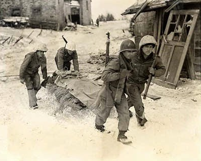 US soldiers carry a wounded German soldier to an aid station on a litter sled in Thirimont.