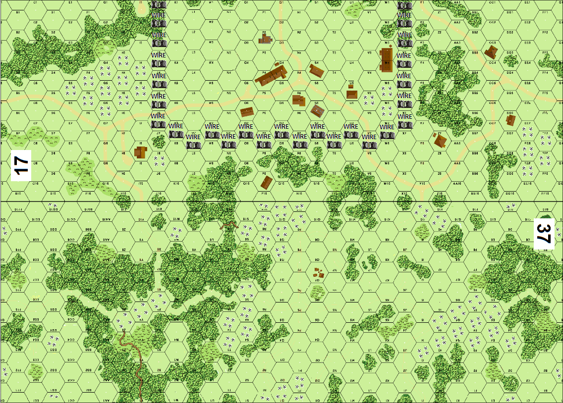 | Misc Rules: | Woods are Brush; Grain/Marsh/Water is OG. A: no vehicle may enter Wire loc |