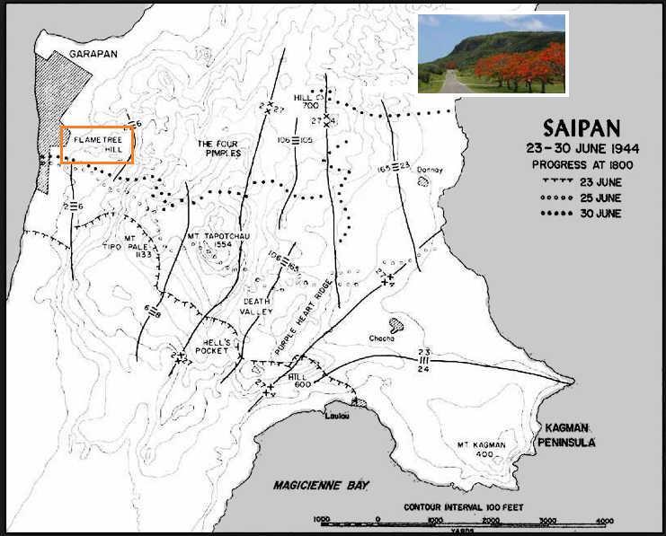 The climatic dawn for the marines had left then fighting mostly on esprit de corps. Though exhausted, they dragged themselves into their jump-off posoitions, buoyed only by the knowledge that victory was in sight, and the fact that strong armored support was finally being provided. The most difficult fighting faced them in the shape of the Japanese strongpoint on Sugar Loaf Hill. One of the worst engagements would be fought on a smallish, flower-covered hill, appearing as a bright bouquet against the ominous gray sandbank of Sugar Loaf behind it. It was full of Japanese, under the flaring red blossoms of its tropical flame trees. At 1030 hours, the Marines moved up the hill against fierce fire.Attacker: American (USMC) (1st and 3rd Battalions, 2nd Marine Regiment)