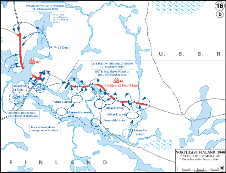 Following an easy crossing into Finland, the 163rd Ukrainian Divison was stopped at Suomussalmi. The unit lay immobile, stretched out for miles along the narrow road leading into the small village. The Finnish 27th Regiment was tasked to surround and cut off the enemy, in the process breaking the road-bound columns up into smaller encirclements known as mottis. To accomplish the mission, the Finns carved out a parallel ice road and used it to array the attacking units. On December 12th, the first road-cutting assault came, cutting through surprised enemy troops just east of Suomussalmi. Russians in the village were cut off from the rest of the division, while other piled toward outlying buildings. A first probe in Suomussalmi was stymied but a second attempt was made on the 14th.Attacker: Finnish (Elements of 27 Jaeger Regiment, 9th Finnish Division)