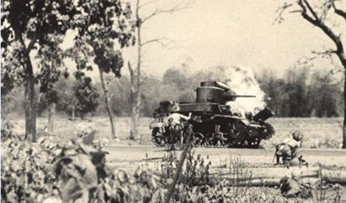 Although the Japanese reinforced their landing at Quinauan Point on the 2nd, the Filipinos continued to contain them. For several days the fighting was at close quarters, each side only yards apart. The attack on February 3rd was typical of this period, and incorporated elements of the 192nd Tank Battalion. The Japanese equipped with daisy chain AT mines would jump out in front of oncoming tanks limited to travelling on the road. The Filipinos fought back with homemade dynamite bundles. The tanks proved invaluable, frequently firing up to 10,000 rounds of machine gun bullets per day. However, it was still an infantryman’s fight relying on rifles, bayonet and grenades.Attacker: Filipino / American (III/57th Infantry Regt (PA) and Company C, 192nd Tank Battalion)