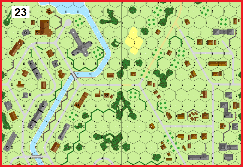 After the Germans turned westward from the Seine on June 9th, the Highlanders were trapped with their backs at the sea. The British formed a defensive perimeter on the 10th around St. Valery and awaited the Germans who arrived the next day. The Germans were greeted by machine gun and AT gun fire and responded with several bayonet charges. The German tanks were ably supported by mortar fire directed from the air and although the Brits were able to hold out all day, the cost was too much. They received orders to withdraw to the Dunkirk beaches where they were to be rescued by the Royal Nvay but this was not destined to occur, as the Germans beat them to the shore. 5,200 men and officers were marched into captivity. . . .A nice little tournament sized scenario pitting the British against the Germans in France. Featuring boards 23 and 49 this is a neat little scenario that can be played in an afternoon. The Germans get infantry, a few tanks and aerial observer directed OBA while the British get infantry and some AT Guns. The British will have some defensive maneuvering to do to keep the Germans out of the victory buildings.Attacker: German (Elements of the 7th Panzer Division)