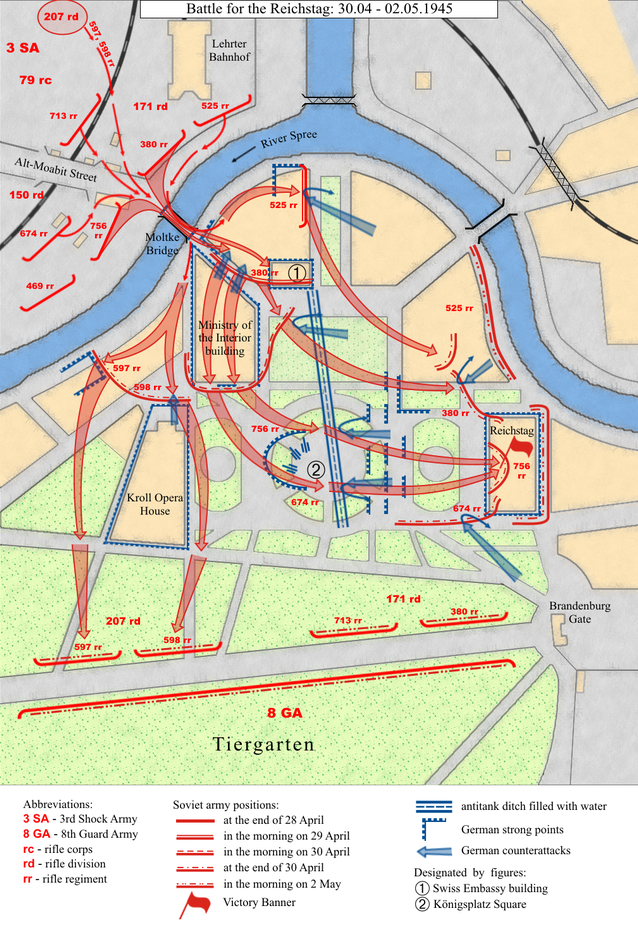 Having crashed over the Moltke Bridge during the evening, the remains of the 150th Guards Division had established a foothold in the buildings at the eastern end of the Diplomatic Quarter. The SS had fled across the wide expanse of the of the A____ to set up a defensive line in the Western Quarter. The SS garrison reinforced the Ministry of the Interior building. The Russians called it "Himmler's House". The SS soldiers and officers of the State Police would fight to defend it to the last man.Attacker: Russian (674th Rifle Regiment, 150th Rifle Division)