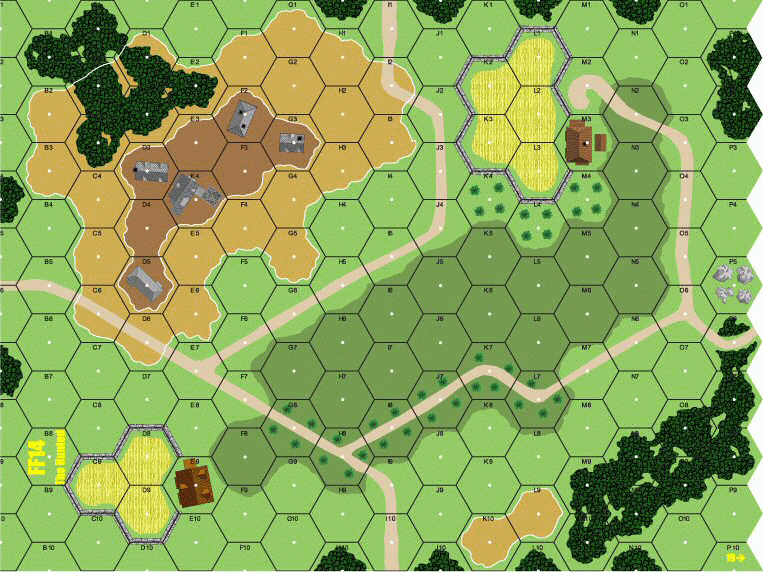 | FF 14 The Hunted Tactical Objective: The Germans must Control 3 of the 5 buildings at game end. Belgian OB: There should only be one MMG, not two. Variable Belgian Units: DR 2-6, the tank should be a T15 Belgian Vehicle Note 17. DR 7-8, the tank is a T-15 Belgian Vehicle Note 17. Variable German Units: All Groups: Add an 8-0 and 2x 4-6-8 squads to all German Variable Units. DR 2-4, the Pz IIA tank is German Vehicle Note 2. DR 5-8, the PSW 222 is German Vehicle Note 70. DR 9-12, the PSW 231(6 Rad) is German Vehicle Note 71. | HOB Website |