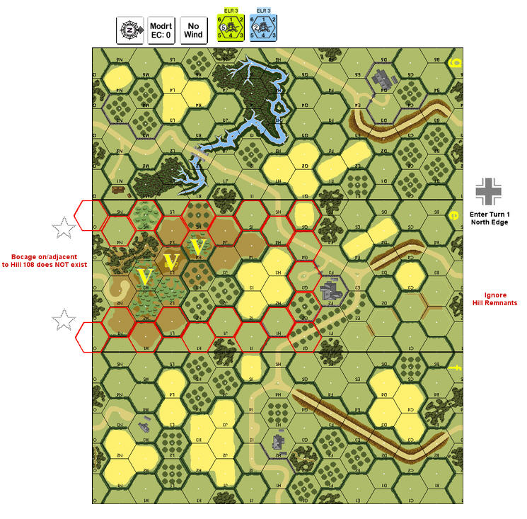 | Misc Rules: | Bocage (B9.5)(Bocage on hillside hexes does not exist). A: AFVs: Schuerzen (D11.2) |