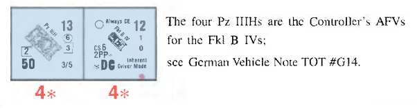 | AFVs: A:14 PzJg Tiger x 4 PzKpfw IIIN x 4 PzKpfw IIIH x 4 Fkl B-IV x 4 SPW 251/2 x 2 |