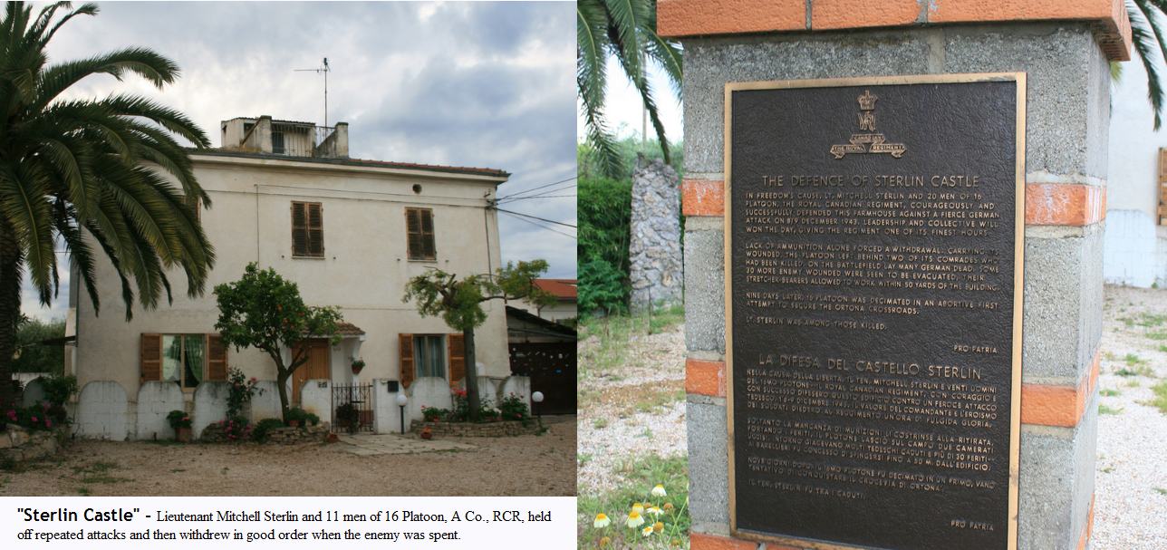By nightfall on 6 December, the Canadian division was across the Moro in two places. The only practicable site was the demolished bridge on the road to San Leonardo. The afternoon of 8 December the First Brigade launched a two-prong assault on San Leonardo with the RCR right hooking out of the Hasty Ps bridgehead while the 48th Highlanders of Canada would cross the Moro and attack La Torre midway between Villa Rogatti and San Leonardo. Attacking southwestwards along a long winding lane soon to be dubbed "Royal Canadian Avenue" the RCR would attack across the front of the 361st Panzer Grenadier Regiment. The Germans retreated and San Leonardo was at last secured, but counter-attack were the order of the day and on Thursday 9 December the German counter-attacked. “A” Company was about to depart when the action started and only one of its platoons, Lieutenant Mitch Sterlin’s was in position to face the attacking Germans. From a two-story house destined to go down in regimental annals as “Sterlin Castle”, the RCRs made their stand.Attacker: German (361st Panzer Grenadier Regiment)