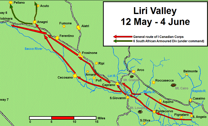 By the evening of 23 May the Anzio beachhead suddenly coming to life and posing a threat to the German Tenth Army's line of communications. As the German defenses crumbled, there was only one possibility of stabilizing the situation in the Liri valley. Six miles northwest of the ruptured Hitler Line, a little river meandered across the floor of the valley. Its name was the Melfa, and if the Germans could hold it, the German Tenth Army might yet be saved. Vokes Force, commanding by Lt-Colonel Vokes and consisting of his British Columbia Dragoons and the Irish Regiment of Canada, would go about halfway to the Melfa and then allow Griffin Force to pass through. Vokes Force plunged into action 0757 hours on 24 May. The B-Squadron, BC Dragoons became the first Allied force to engage Mark V Panther tank. Lieutenant Taylor never forgot his shock at seeing the Panther, but fortunately he spotted the Panther before the German saw him...Attacker: Canadian (Elements of Irish Regiment of Canada with B-Squadron British Columbia Dragoons)