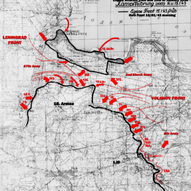 Without pause, the second and third phase of this second battle of Lake Ladoga began. The two old corner-posts of the German defence continued to play their former part. The strongpoint of Gorodok with its hospital and power station on the Neva, at the other end, the fortified positions known as the "Wrengler Barrier". Time and again throughout the Soviet tank attacks, the guns of the 1st Battalion, 240th Artillery Regiment relieved the grenadiers and engineers by timely defensive fire or concentrated bombardment of the focal points of the attack. Late in the afternoon of the 17th the First Troop guns went silent.Attacker: Russian (Elements Soviet 136th Rifle Division, supported by the 61st Tank Brigade)