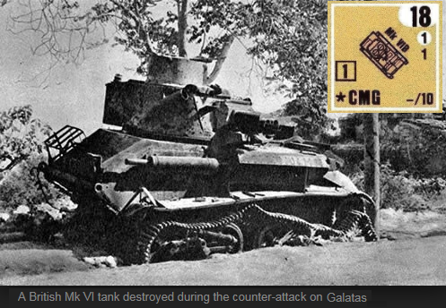 The British had just been thrown out of the small village of Galatas. Two tanks made a quick recon, and were then ordered to lead a counterattack. As the light faded, screams of vengeance rose from the British column. The mountain troops would feel their wrath.Attacker: New Zealand (23rd N.Z. Battalion, 10th Brigade)