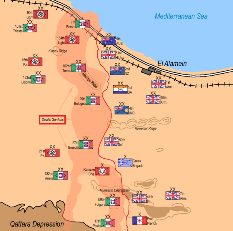 Rommel tried to breach the Alamein line, but failed and was forced to the defensive. Much better supplied, Monty soon attained a 2-to-1 advantage in men and material. This allowed him to strike first at the ailing Axis armies. The first step in his offensive would be to breach the mile deep minefields to his front – the Devil’s Garden. . .Attacker: Italian (Forward company of the Trento Division)