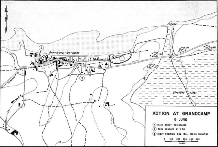 "29 Let's Go!" -- Two days after D-Day, the German 352nd Infantry Division, now decimated, was forced to withdraw in the face of an American push from Omaha Beach. In the small port of Grandcamp, they made a stand. The swampy terrain was an asset to the Germans, and so was a small stream protecting the eastern approaches to the village. Around midday, a group of Rangers were fought off. A more powerful American attack was then prepared. After a one-hour naval bombardment, K and L Companies of the 116th Infantry Regiment launched an assault with the support of Sherman tanks. . .Attacker: American (5th Rangers/K and L Companies, 3rd Battalion, 116th Infantry Regiment "Stonewallers" and 743rd Tank Battalion)