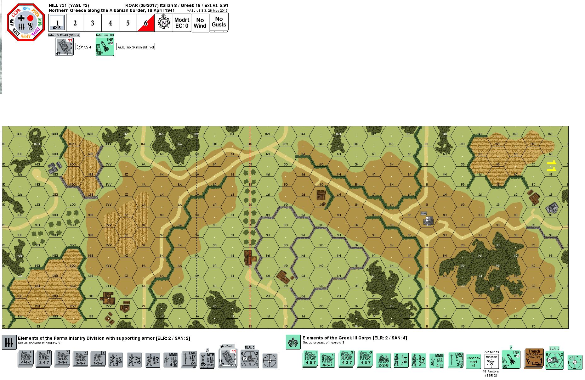 To support the German invasion of Yugoslavia and Greece, the Italian Armies on the Albanian border were to apply as much pressure as possible on the Greek Corps opposite them. This would prevent the Greeks from linking up with any Yugoslavian units, and also keep them from falling back and escaping being cut off by Axis units approaching from the northeast. One such engagement was at Hill 731, a key position where the Italians suffered heavy casualties two months earlier in a failed attack.Attacker: Italian (Elements of the Parma Infantry Division with supporting armor)
