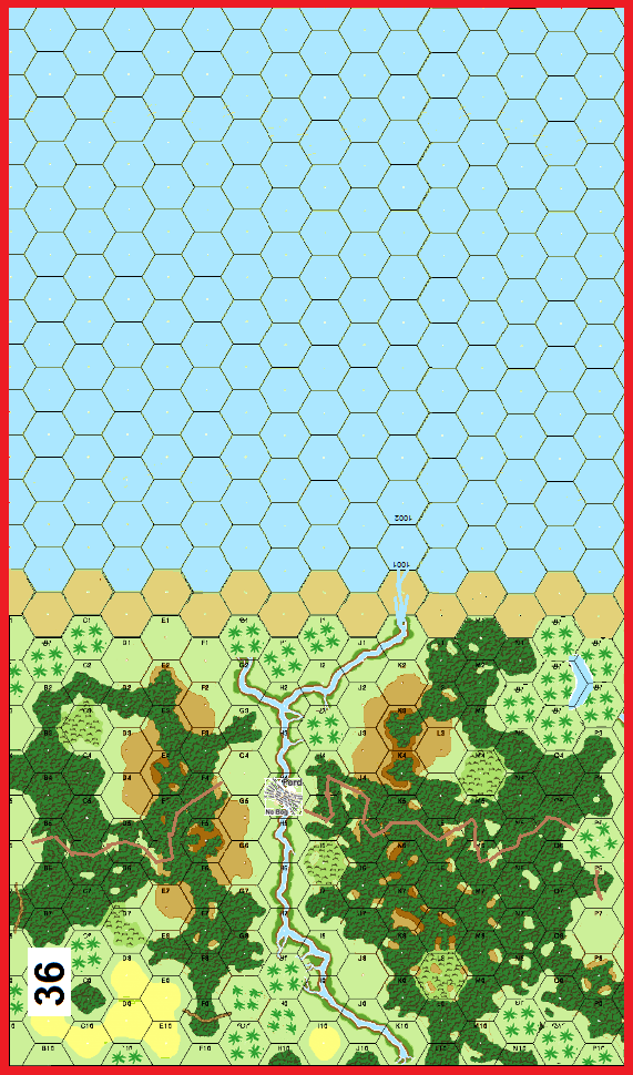 In the early hours of the 12th November, 1944 the 2/8th Battalion (A.I.F.), as part of the 6th Australian Division, arrived in New Guinea. Its first task was to capture the line Abau – Malin and destroy the enemy forces between this line and the Danmap River. The next phase of the Battalion’s operation was to advance along the coast to secure the Wewak area. Operations on May 17th began with an airstrike and artillery concentration on Cape Boram which lay in the path of advance. As B Company crossed the start line with tanks of C Squadron 2/4th Armoured Regiment, the company began clearing the peninsula without opposition but the enemy were encountered all along the coastal strip east of Boram Creek. At the mouth of the creek the Japanese offered stubborn resistance from bunkers and foxholes in a strongly defended locality on the east bank. . . .The Australian 2/8th Battalion must force a crossing of Boram Creek (the stream on Board 36) in the face of an entrenched Japanese defense based around eight squads and four crews manning 2 MMGs, an HMG and a 75mm infantry gun. The Japanese also have 3 pillboxes available.Attacker: Australian (B Co., 2/8th Battalion, 6th Division)