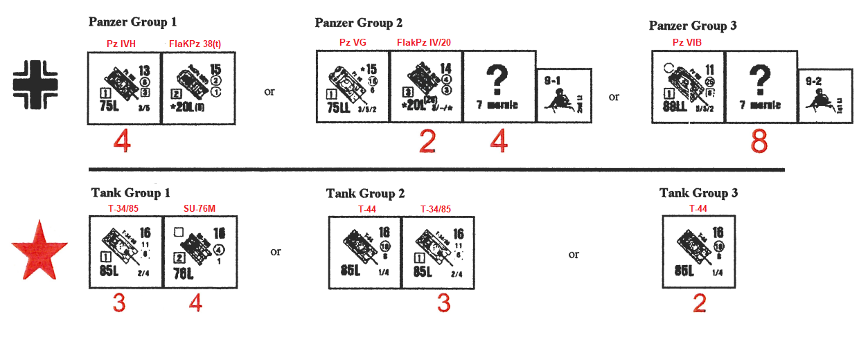 | Misc Rules: | Variable armor OB both sides. All roads paved, Soft Ground. D: Ammo and fuel shortage |