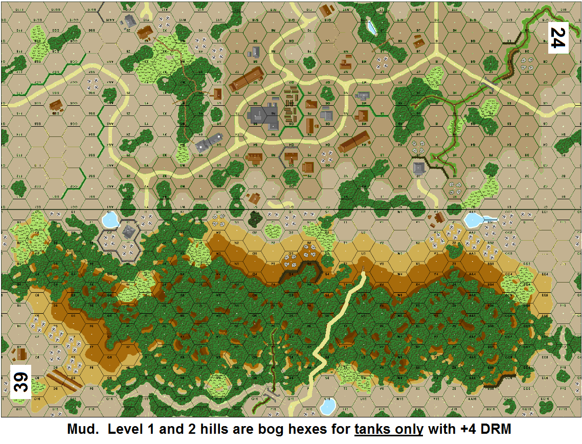 | Misc Rules: | Mud (D8.23); Level 1 and 2 on board 39 are bog hexes for tanks only |
