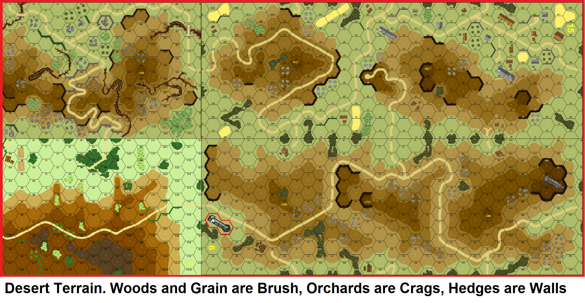 | Misc Rules: | Desert Terrain. Woods and Grain are Brush, Orchards are Crags, Hedges are Walls |