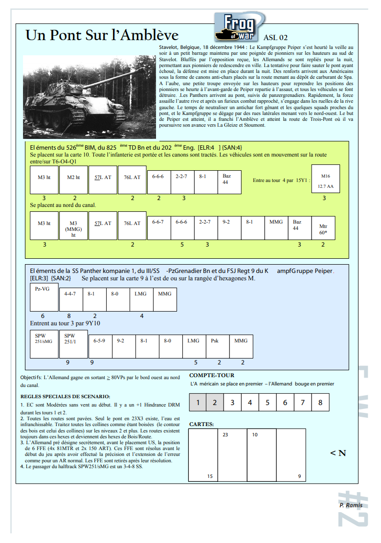 "A Bridge on the Ambleve"- Kampfgruppe Peiper collided the night before with a small roadblock maintained by a handful of pioneers on the heights south of Stavelot. Bluffed by the opposition received, the Germans retreated for the night, allowing the pioneers to go back down to the city. The attempt to blow up the bridge having failed, the defense is put into place during he night. Reinforcements arrive to the Americans in the form of anti-tank cannons placed on the road leading to the Spa fuel depot. At dawn. a small troop sent to the heights to take up the positions of the pioneers, collided with Pieper's vanguard who had gone back on the assault, and all vehicles were destroyed. The Panthers arrived at the bridge, followed by Panzergrenadiers. Quickly, the force assaulted the other bank and after furious close combat , engaged in the alleys of the left bank. With time to neutralize a very embarrassing anti-tank gun and the few squads close to the bridge, the Kampfgruppe is released by side streets leading to the northwest. Peiper's goal is reached, he has crossed the Ambleve and reached the road of Trois-Pont where he will continue his advance towards La Gleize amd Stoumont
