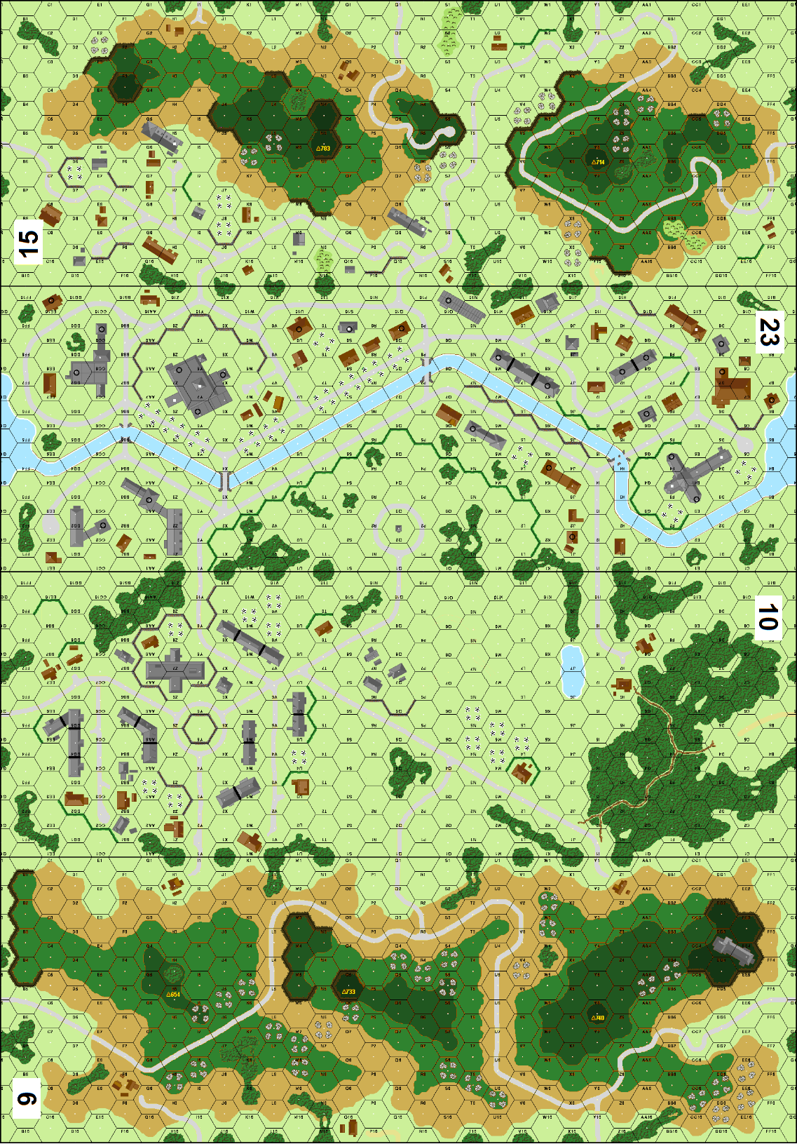 Misc Rules: Paved rds, Level 2 hills and above are Wooded, canal impassable except by single bridge