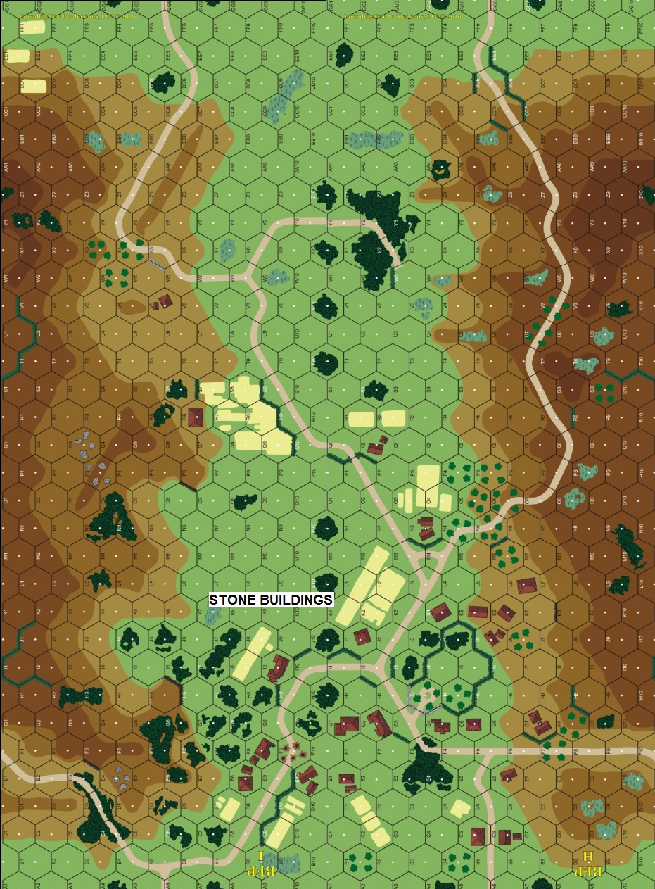 | Misc Rules: | Bldgs: Stone, NQ (A20.3). A: split force enters east and west. D: may exit Turn 5 |