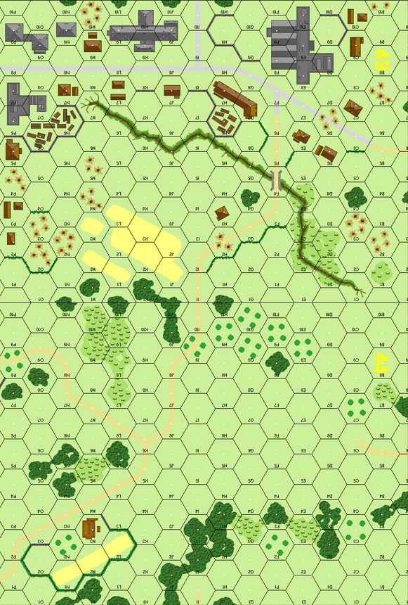 | Misc Rules: | No hills. Orchards on Bd 49 are Shellholes. Gully is Mud, Bog chk required. A: Elite |