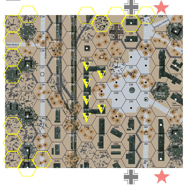 One of Rodimtsev's junior officers, Lieutenant Anton Kuzmich Dragan was personally ordered by Chuikov to hold a key railroad station in downtown Stalingrad against an impending German assault. Dragan proceeded to gather a platoon of less than fifty men and moved them over to the railroad station. Here, the small but determined force prepared itself for the German attack. Soon after digging in, a substantial force of German infantrymen arrived to seize control of the station. The Russians proceeded to repeatedly frustrate the Germans in an epic room-by-room struggle for control of the depot for nearly THREE WEEKS. Breaking through walls, crawling over rafters, and burrowing under the floorboards, the Russians would yield but a portion of the structure to the Germans, only to emerge elsewhere and start the struggle all over again. Exchanging gunfire down hallways, hurling grenades back and forth between rooms, Dragan's men inflicted significant casualties on the Germans. In spite of this heroic resistance, Dragan's platoon was eventually reduced to a handful of men. After running out of ammunition, and with their rations gone, one of the Soviet Guardsmen took out his bayonet and carved on a wall, "Rodimtsev's Guardsmen fought and died for their country here." Under cover of darkness, Dragan and the five remaining soldiers under his command eventually slipped out of the building, made their way through the German lines, and were reunited with the remainder of the division.Attacker: Russian (NKVD)/Russian (10th NKVD Division / 1st Company, 1st Battalion, 42nd Guards Regiment, 13th Guards Rifle Division)